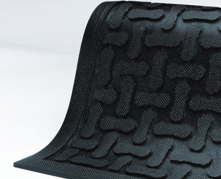- This rubber floor mat utilizes a “dog bone” surface profile to provide comfort and elevate feet above any liquids and debris that may accumulate on top of the floor mat.